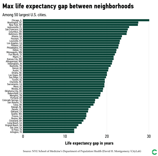 The CDC’s life expectancy estimates are based on deaths in each census tract—the closest thing to a neighborhood—from 2010 to 2015. While some neighborhoods may have changed since then, particularly in places like San Francisco and New York, for the most part this remains a good estimate of how long the typical person residing in a given area might live. (For some places with a small number of deaths, the researchers used a statistical model to estimate life expectancy based on the trends in demographically similar neighborhoods.)